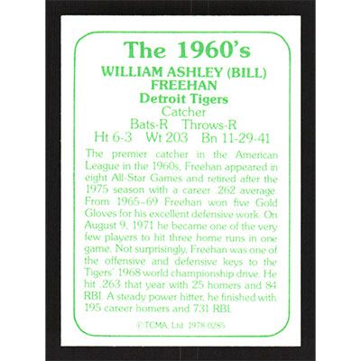 This is a 1978 TCMA 60's Bill Freehan baseball card. The card is #285 and pictures show condition.