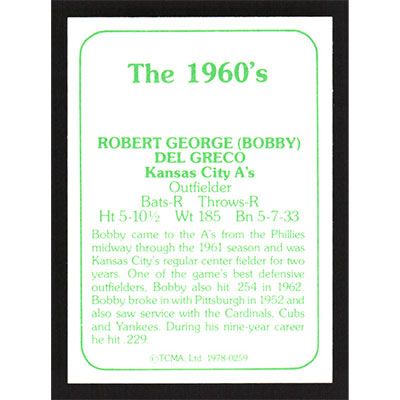 This is a 1978 TCMA 60's I Bob Del Greco baseball card. The card is #259 and pictures show condition.