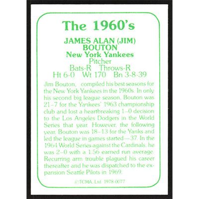 This is a 1978 TCMA 60's I Jim Bouton baseball card. The card is #NNO and pictures show condition.
