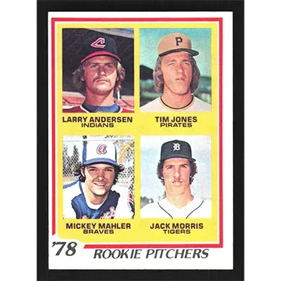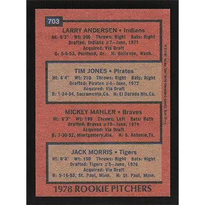 This is a 1978 Topps Larry Andersen, Tim Jones, Mickey Mahler and Jack Morris Rookie Pitchers baseball card. The card is #703 and pictures show condition.