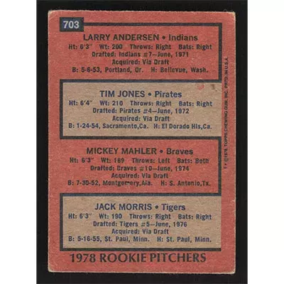 This is a 1978 Topps Larry Andersen, Tim Jones, Mickey Mahler and Jack Morris Rookie Pitchers baseball card. The card is #703 and pictures show condition.