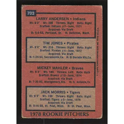 This is a 1978 Topps Larry Andersen, Tim Jones, Mickey Mahler and Jack Morris Rookie Pitchers baseball card. The card is #703 and pictures show condition.
