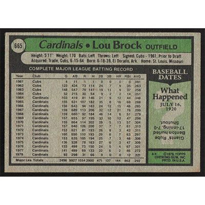 This is a 1979 Topps Lou Brock baseball card. The card is #665 and pictures show condition.