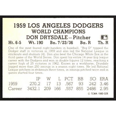 This is a 1980 TCMA '59 Dodgers Don Drysdale baseball card. The card is #28 and pictures show condition.