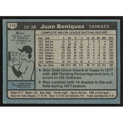 This is a 1980 Topps Juan Beniquez baseball card. The card is #114 and pictures show condition.