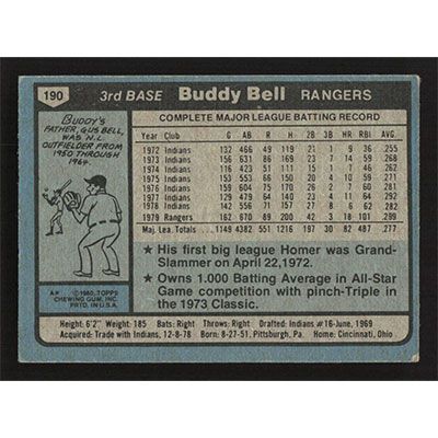 This is a 1980 Topps Buddy Bell baseball card. The card is #190 and pictures show condition.