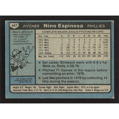 This is a 1980 Topps Nino Espinosa baseball card. The card is #447 and pictures show condition.