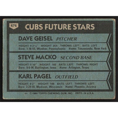 This is a 1980 Topps Dave Geisel, Steve Macko and Karl Pagel Future Stars baseball card. The card is #676 and pictures show condition. Team(s): Chicago Cubs Rookie Card (RC)