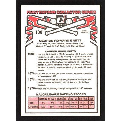 This is a 1981 Donruss George Brett baseball card. The card is #100 and pictures show condition.
