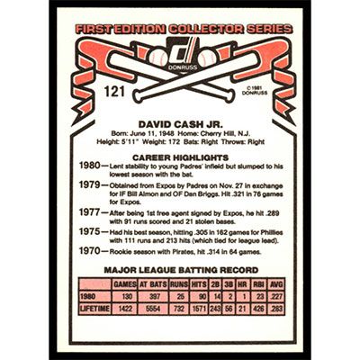 This is a 1981 Donruss Dave Cash baseball card. The card is #121 and pictures show condition.