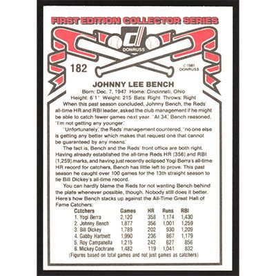 This is a 1981 Donruss Johnny Bench baseball card. The card is #182 and pictures show condition.