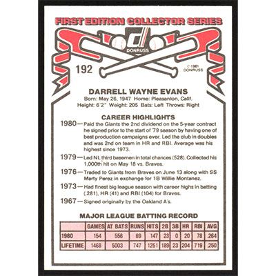 This is a 1981 Donruss Darrell Evans baseball card. The card is #192 and pictures show condition.