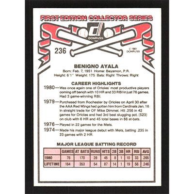 This is a 1981 Donruss Benny Ayala baseball card. The card is #236 and pictures show condition.