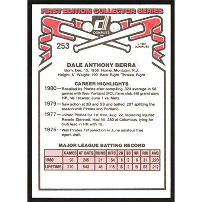 This is a 1981 Donruss Dale Berra baseball card. The card is #253 and pictures show condition.