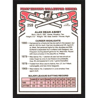 This is a 1981 Donruss Alan Ashby baseball card. The card is #259 and pictures show condition.