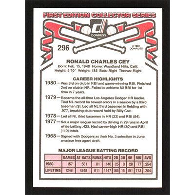 This is a 1981 Donruss Ron Cey baseball card. The card is #296 and pictures show condition.