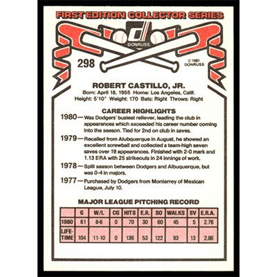 This is a 1981 Donruss Bobby Castillo baseball card. The card is #298 and pictures show condition.