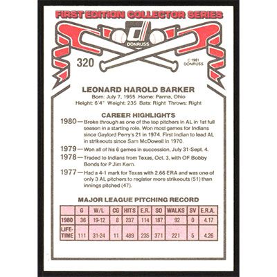This is a 1981 Donruss Len Barker baseball card. The card is #320 and pictures show condition.