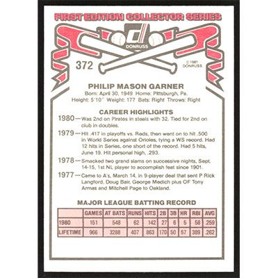 This is a 1981 Donruss Phil Garner baseball card. The card is #372 and pictures show condition.