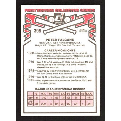 This is a 1981 Donruss Pete Falcone baseball card. The card is #395 and pictures show condition.