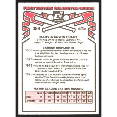 This is a 1981 Donruss Marvis Foley baseball card. The card is #399 and pictures show condition.
