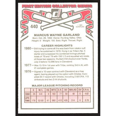 This is a 1981 Donruss Wayne Garland baseball card. The card is #440 and pictures show condition.