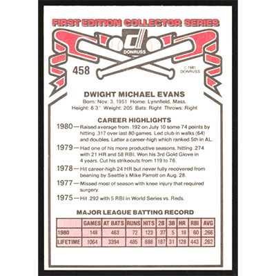This is a 1981 Donruss Dwight Evans baseball card. The card is #458 and pictures show condition.