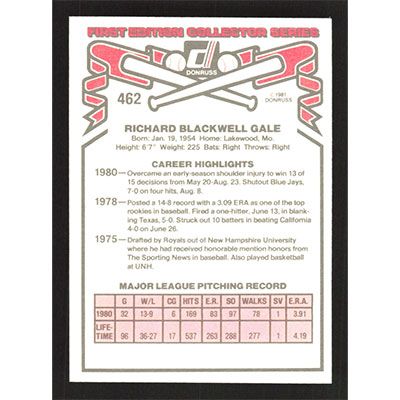 This is a 1981 Donruss Rich Gale baseball card. The card is #462 and pictures show condition.