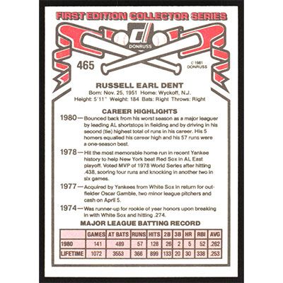 This is a 1981 Donruss Bucky Dent baseball card. The card is #465 and pictures show condition.