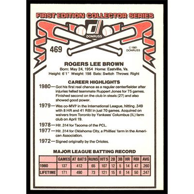 This is a 1981 Donruss Bobby Brown baseball card. The card is #469 and pictures show condition.