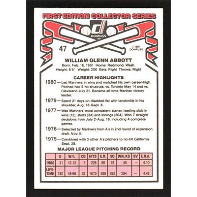 This is a 1981 Donruss Glenn Abbott baseball card. The card is #47 and pictures show condition.