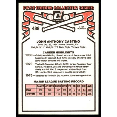 This is a 1981 Donruss John Castino baseball card. The card is #488 and pictures show condition.