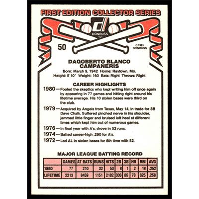 This is a 1981 Donruss Bert Campaneris baseball card. The card is #50 and pictures show condition.