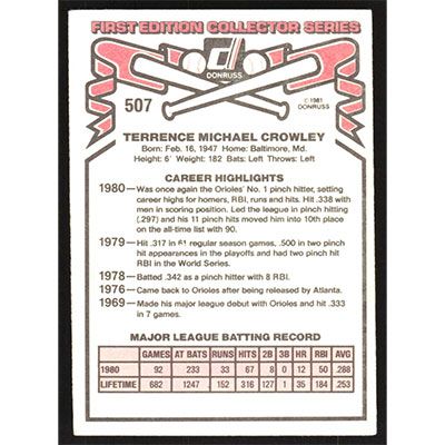 This is a 1981 Donruss Terry Crowley baseball card. The card is #507 and pictures show condition.
