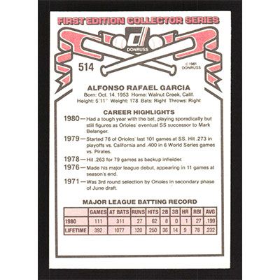 This is a 1981 Donruss Kiko Garcia baseball card. The card is #514 and pictures show condition.