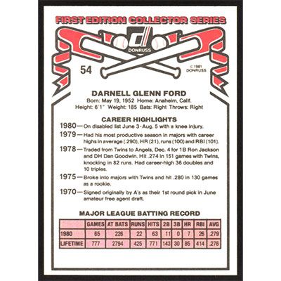 This is a 1981 Donruss Dan Ford baseball card. The card is #54 and pictures show condition.