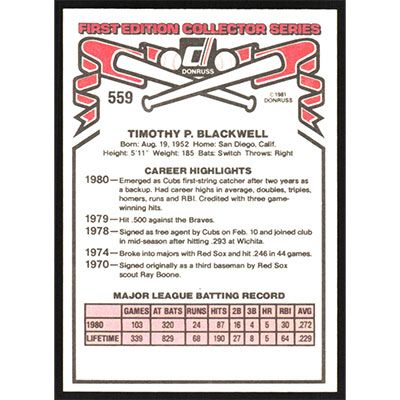 This is a 1981 Donruss Tim Blackwell baseball card. The card is #559 and pictures show condition.