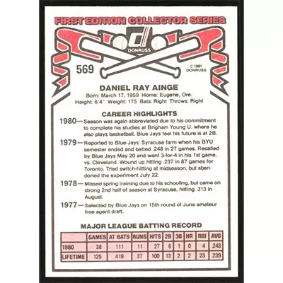 This is a 1981 Donruss Danny Ainge baseball card. The card is #569 and pictures show condition.