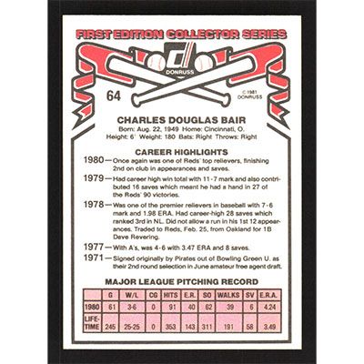 This is a 1981 Donruss Doug Bair baseball card. The card is #64 and pictures show condition.