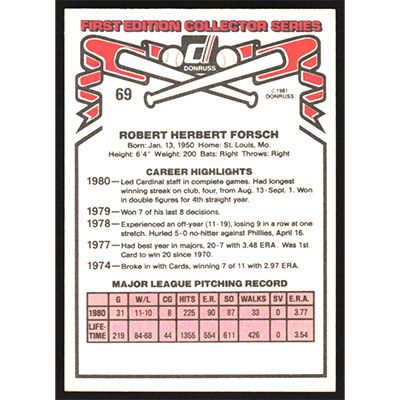 This is a 1981 Donruss Bob Forsch baseball card. The card is #69 and pictures show condition.