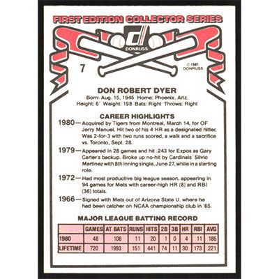 This is a 1981 Donruss Duffy Dyer baseball card. The card is #7 and pictures show condition.