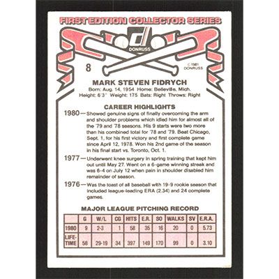 This is a 1981 Donruss Mark Fidrych baseball card. The card is #8 and pictures show condition.