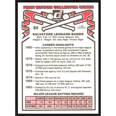 This is a 1981 Donruss Sal Bando baseball card. The card is #84 and pictures show condition.