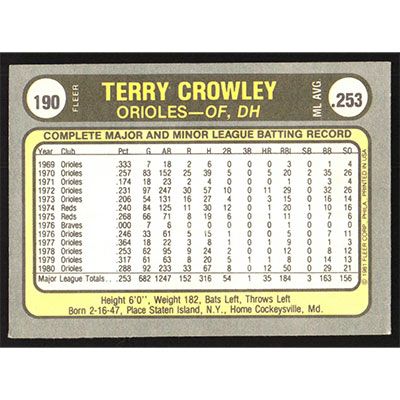 This is a 1981 Fleer Terry Crowley baseball card. The card is #190 and pictures show condition.