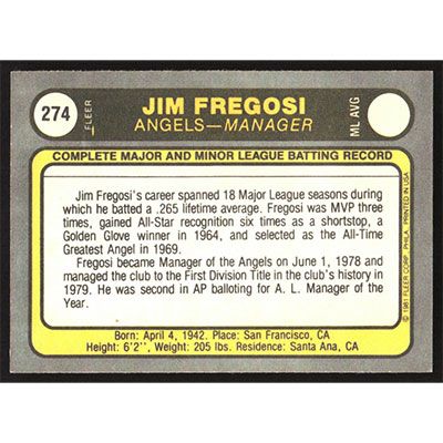 This is a 1981 Fleer Jim Fregosi baseball card. The card is #274 and pictures show condition.