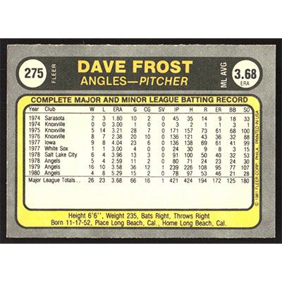 This is a 1981 Fleer Dave Frost baseball card. The card is #275 and pictures show condition.