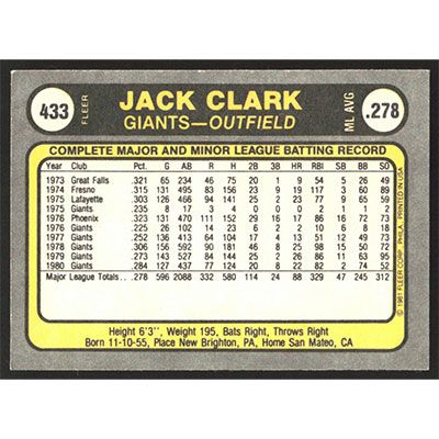 This is a 1981 Fleer Jack Clark baseball card. The card is #433 and pictures show condition.