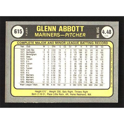 This is a 1981 Fleer Glenn Abbott baseball card. The card is #615 and pictures show condition.