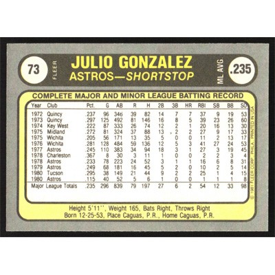 This is a 1981 Fleer Julio Gonzalez baseball card. The card is #73 and pictures show condition.
