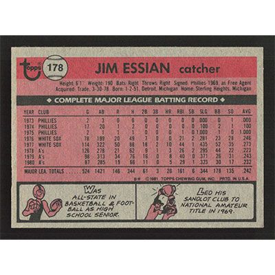 This is a 1981 Topps Jim Essian baseball card. The card is #178 and pictures show condition.